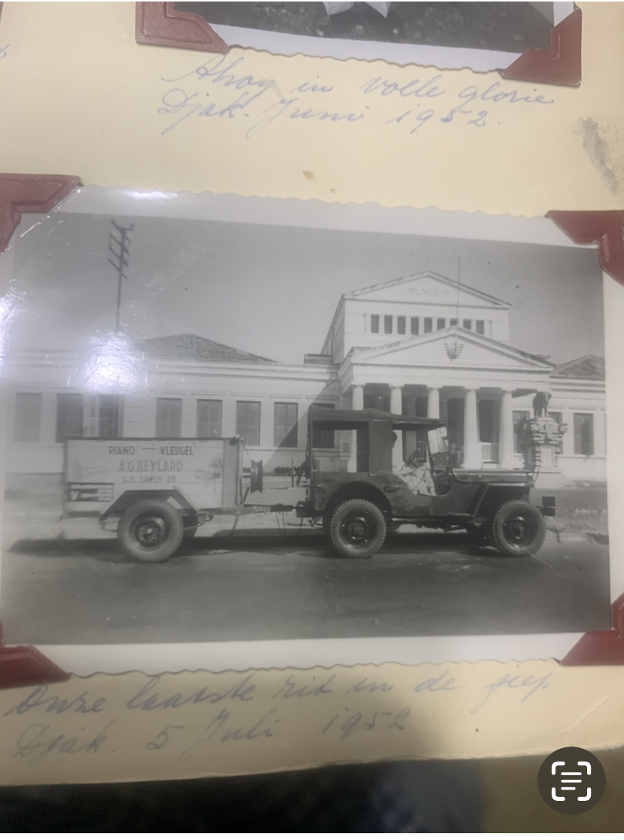 Alex Keylard’s vehicle for delivering pianos, taken in Jakarta in 1952. His wife, mother of Rich and Jerry Keylard, sits in front.